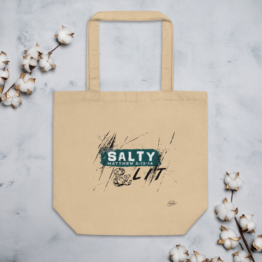 "Stay Salty and Lit” Tan Eco Tote Bag – (Matthew 5:13-14), KJV